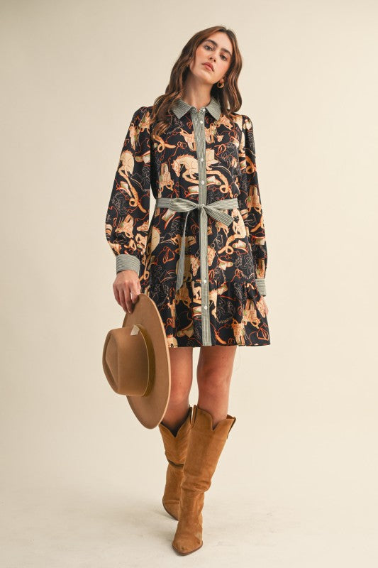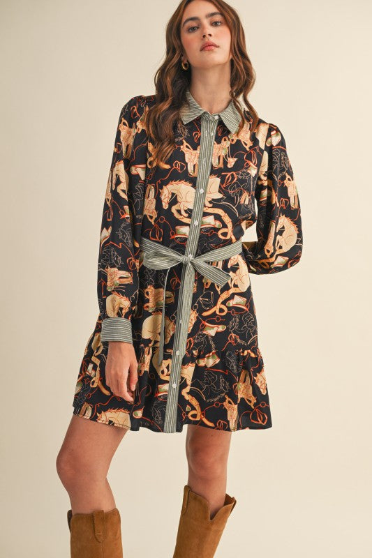 Western Get ready to wrangle in style with the Hold your Horses Mini! This adorable western print button down boasts a contrast striped collar neckline and button down placket for a touch of charm. The long ruffle hem adds a feminine touch, while the lining ensures a comfortable fit. Saddle up and stand out in this must-have mini!